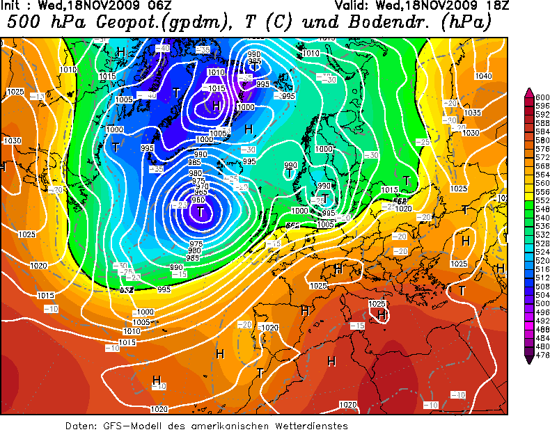 500-hPa-Geopotential und Bodendruck, 18.11.2009, 12 UTC