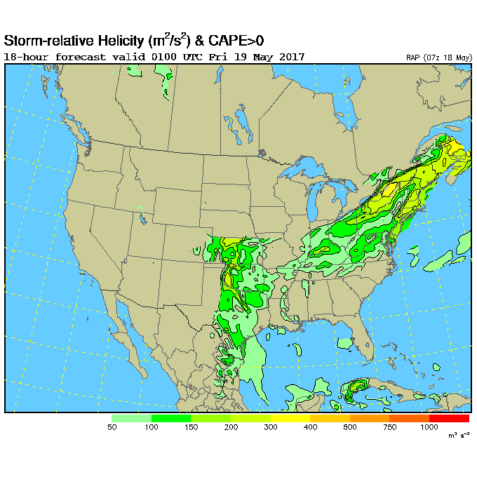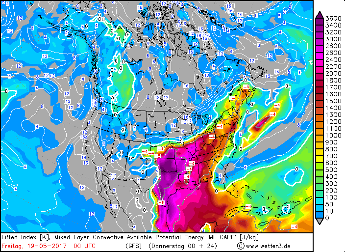 von Texas nach Oklahoma und Kansas. Mit der Feuchtezunahme in den unteren Troposphärenschichten nimmt die Labilität im Tagesverlauf stark zu