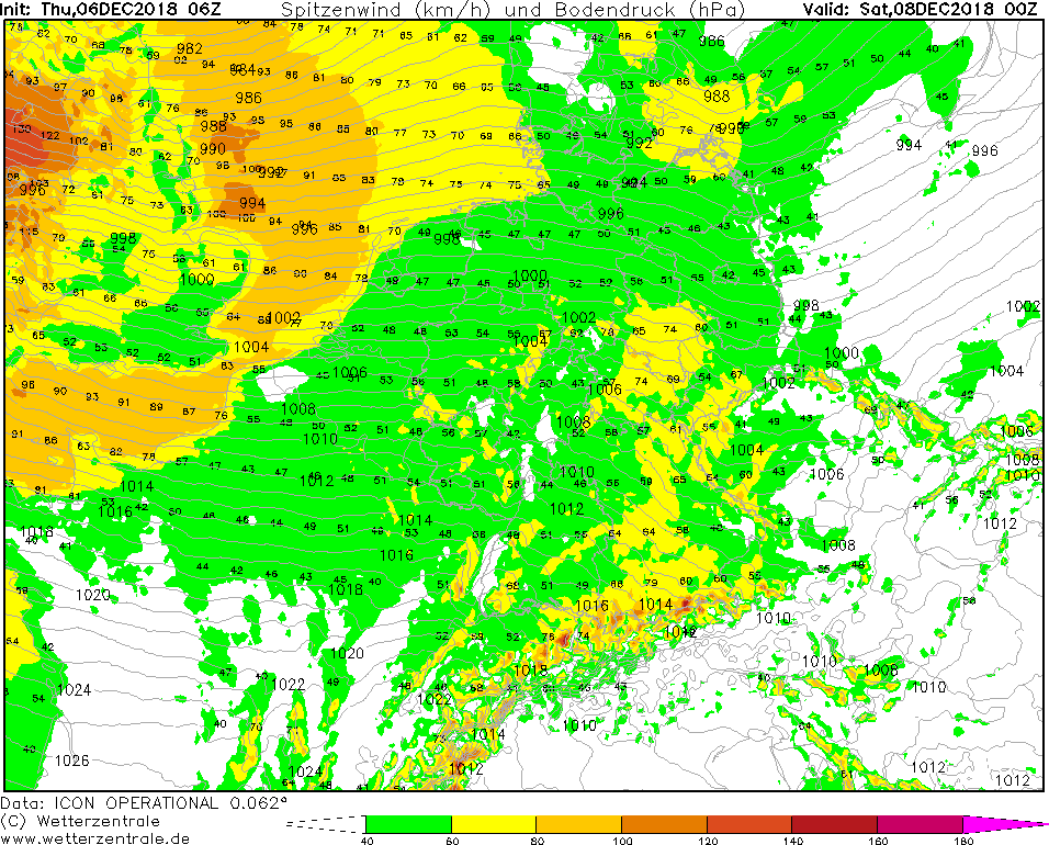will be gale gusts up to 70kt or 126km/h. In the area of wind maxima gusts up to 78kt or 141km/h are possible! Also on Sunday it remains still windy.