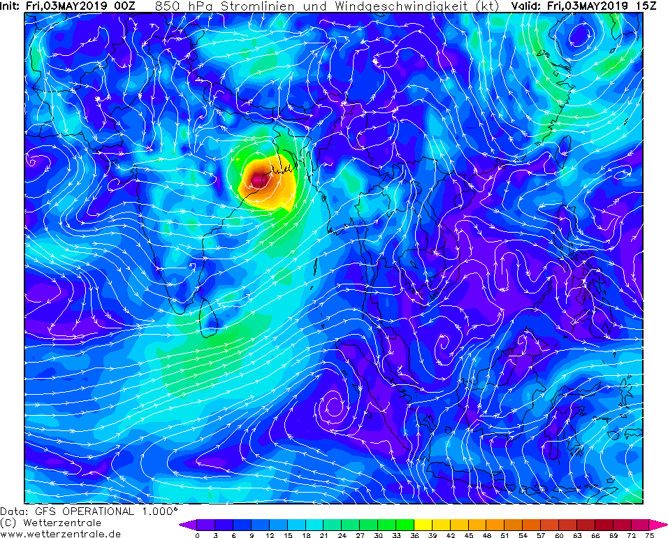 made landfall. On 03 May at 18 UTC the mean wind speeds are still up to 150 kph, on 04 May at 06 UTC up to 75 kph.