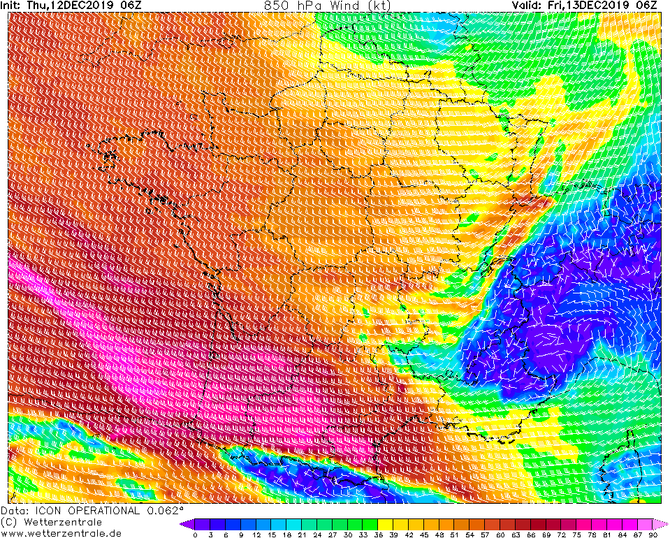 850 hPa Wind gusts, France, 13.12., 06 UTC