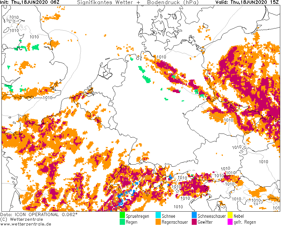Along a convergence line in the north of Germany, which also represents an air mass boundary, showers and weak thunderstorms are forming today,