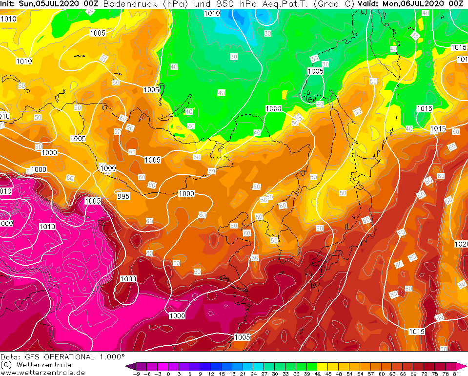 Japanese monsoon season continues with heavy precipitation in the south and south-west of Japan. Almost stationary high pressure system in western pacific directs