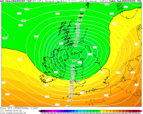 The core of KIRSTEN moves further east across Ireland and Great Britain across the North Sea to Denmark. The pressure in the center rises slightly again and the air