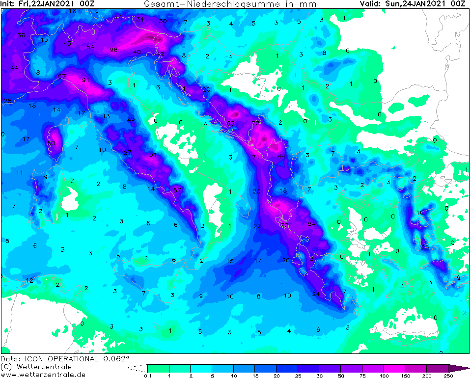 Total precipitation amount,Italy and Balkan region, 24.01., 00 UTC