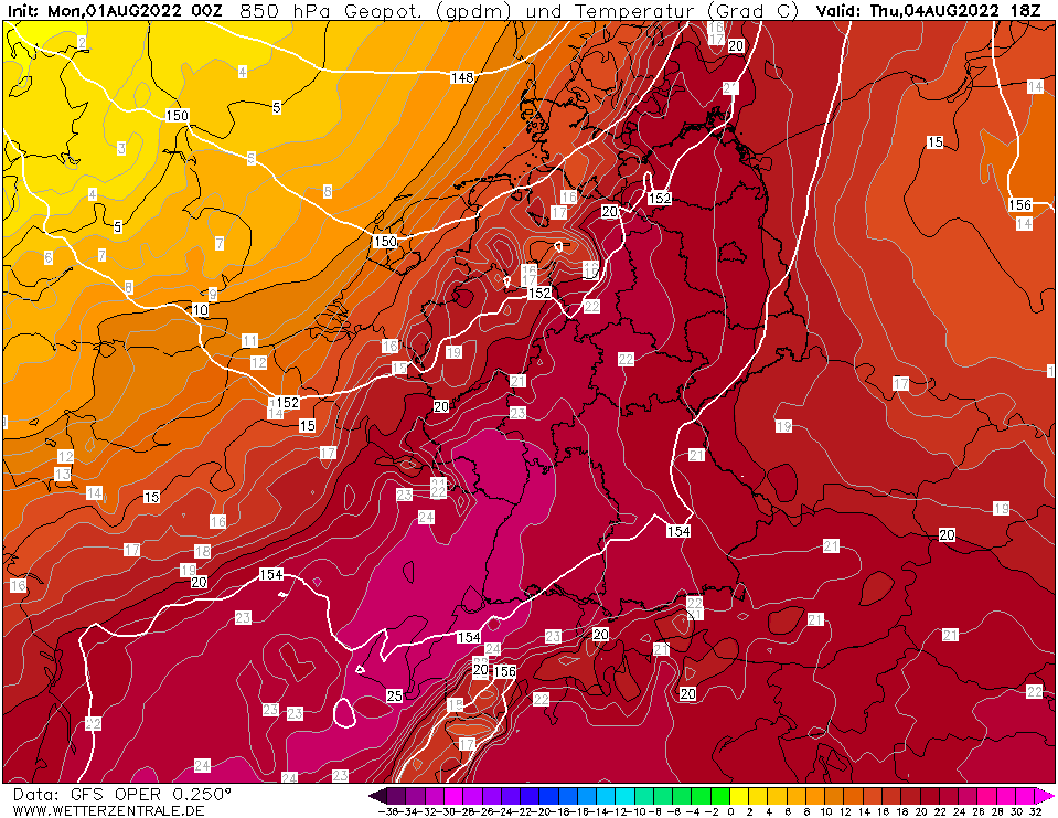 As of tomorrow, 850 hPa-temperatures are expected to reach above the 15 °C-mark across the southern part of Central Europe, therefore at surface level daytime maximum temperatures are expected to reach above the 30 °C-mark. Temperatures are expected to rise further on Wednesday, August 03, 2022, and Thursday, August 04, 2022, with 850 hPa-temperatures reaching more than 20 °C over large parts France and Central Europe.