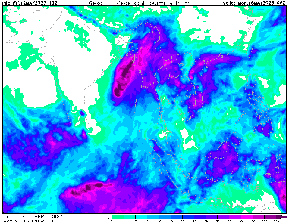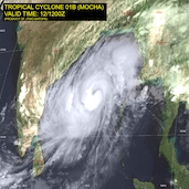 The favorable conditions over the Bay of Bengal lead to the rapid intensification of the tropical cyclone MOCHA in the past 24 hours. Warm sea surface temperatures, with water temperatures > 30 °C, both strong low-level convergence and upper-level divergence created favorable conditions for tropical cyclone intensification and are expected to prevail. Therefore, the cyclone intensity of extremely severe cyclonic storm MOCHA is expected to remain constant before the landfall of the cyclone.
