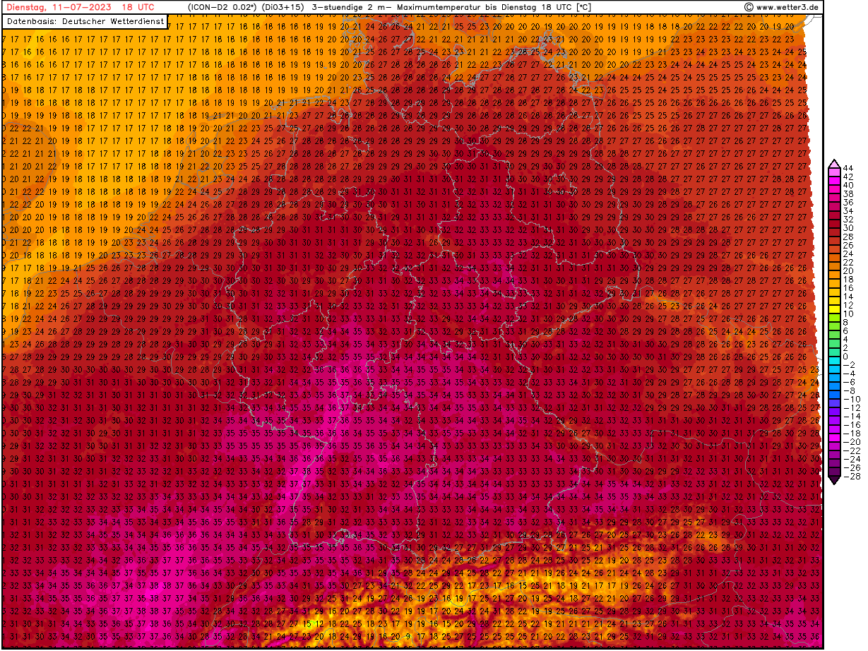 6 h maximum temperatures over Central Europe, 11.07 18 UTC