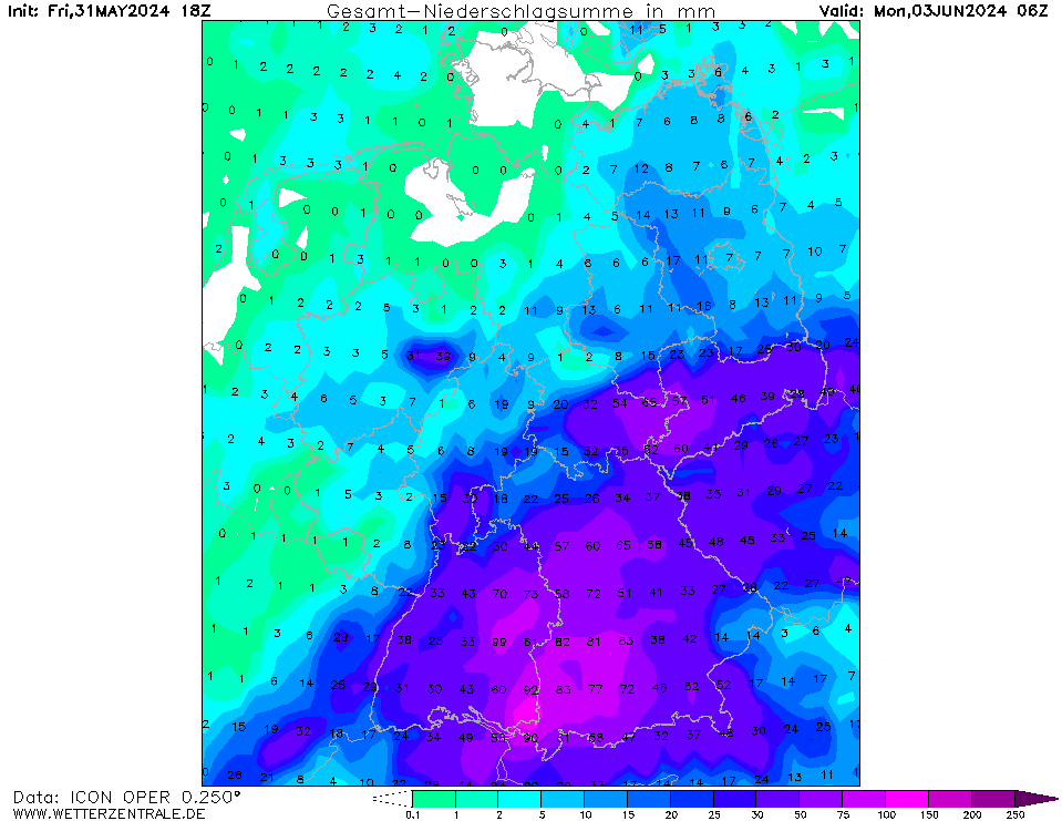 Heavy rains in Southern Germany are expected to continue until Monday morning, June 03, 2024. After widespread precipitation totals of more than 150 mm, the area from the Swabian Jura over the Alpine Foothills to Munich must expect another 50 mm of rain. Along the Danube as well as their southern feeder rivers, extreme river flooding must be expected.