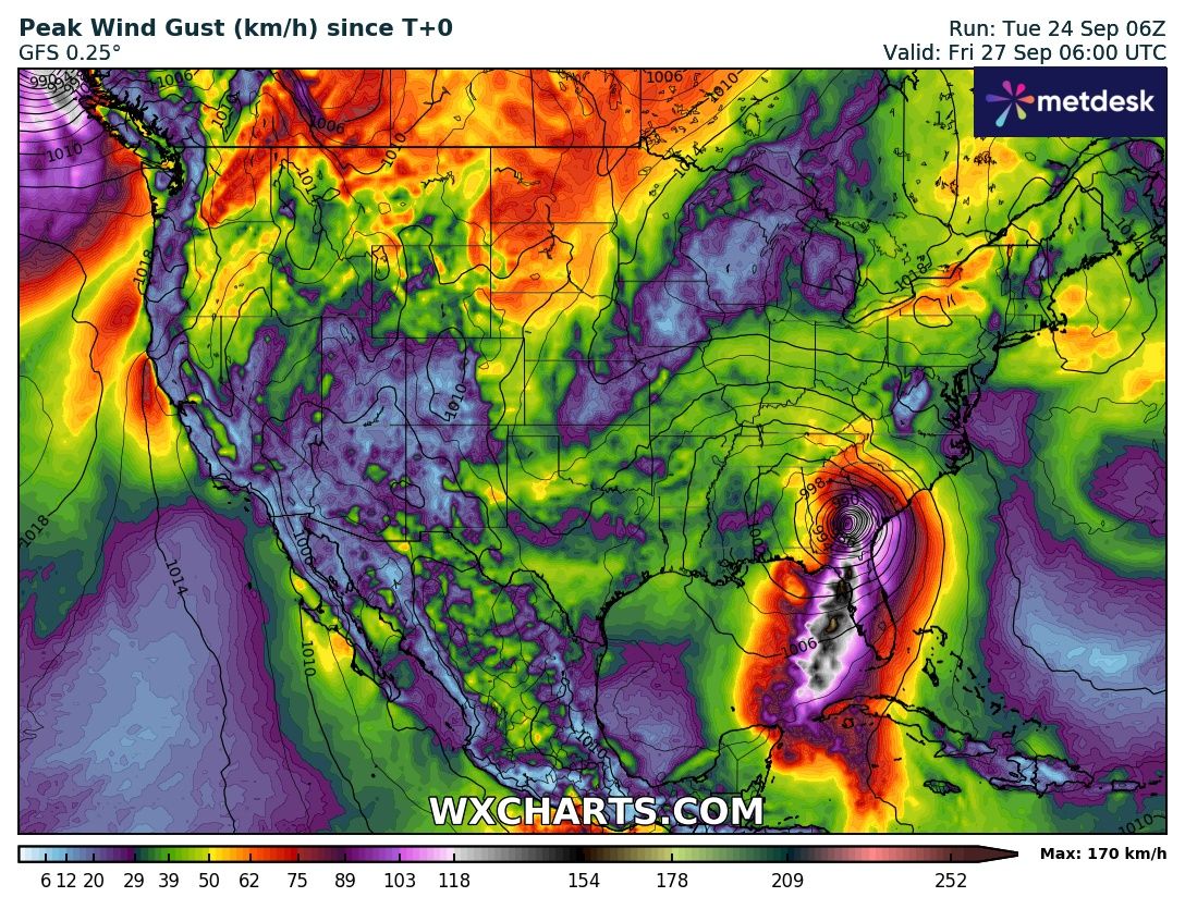| Maximum wind gusts over the Contiguous US, until 27.09 06 UTC