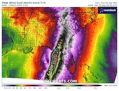 | Maximum wind gusts over the Southeastern US, until 28.09 06 UTC
