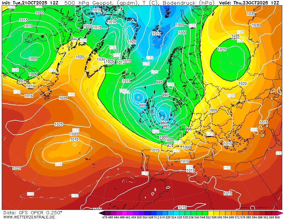 500 hPa geopotential and sea-surface pressure over Europe, 23.10 12 UTC