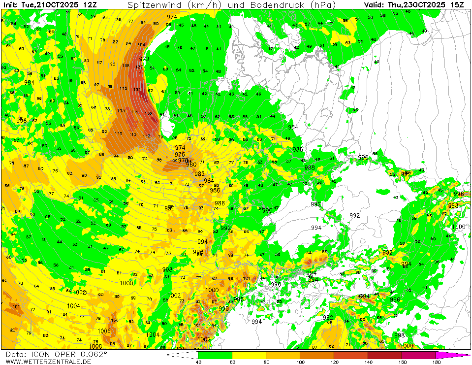 The first significant winter storm of the coming winter season 2025/26 is forecasted to impact the British Isles and Central Europe tomorrow, October 22, 2025, and Thursday, October 23, 2025. Widespread wind gusts of more than 80 kph are likely. Along the North Sea and exposed mountain ranges, gusts of more than 100 kph are expected.