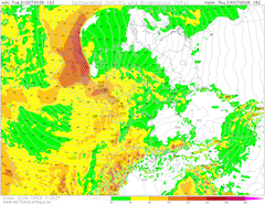 Behind the warm front of the secondary low, a widespread storm field will impact France and Germany. Gusts of more than 80 kph are likely. Current NWP output indicates that the secondary low likely develops into a Shapiro-Keyser cyclone. Characteristic of such cyclones is a displaced rather weak cold front. Indeed, it is expected that the cold front will reach Western Germany before midday. During the passage of the cold front, at times, heavy precipitation is likely. On the back side of the surface low, the warm jet of the low will wrap around the pressure center. In addition, a sharp pressure gradient will develop along the backside of the low. At the tip of the bent-back warm front, hurricane-force wind gusts are possible. Along the North Sea, wind gusts of more than 120 kph are possible. In the rare chance that a sting jet develops, inward locations of the Netherlands and Northern Germany may also experience wind gusts in excess of 120 kph.