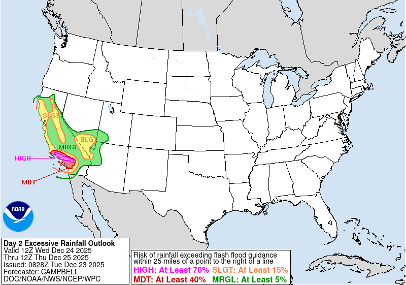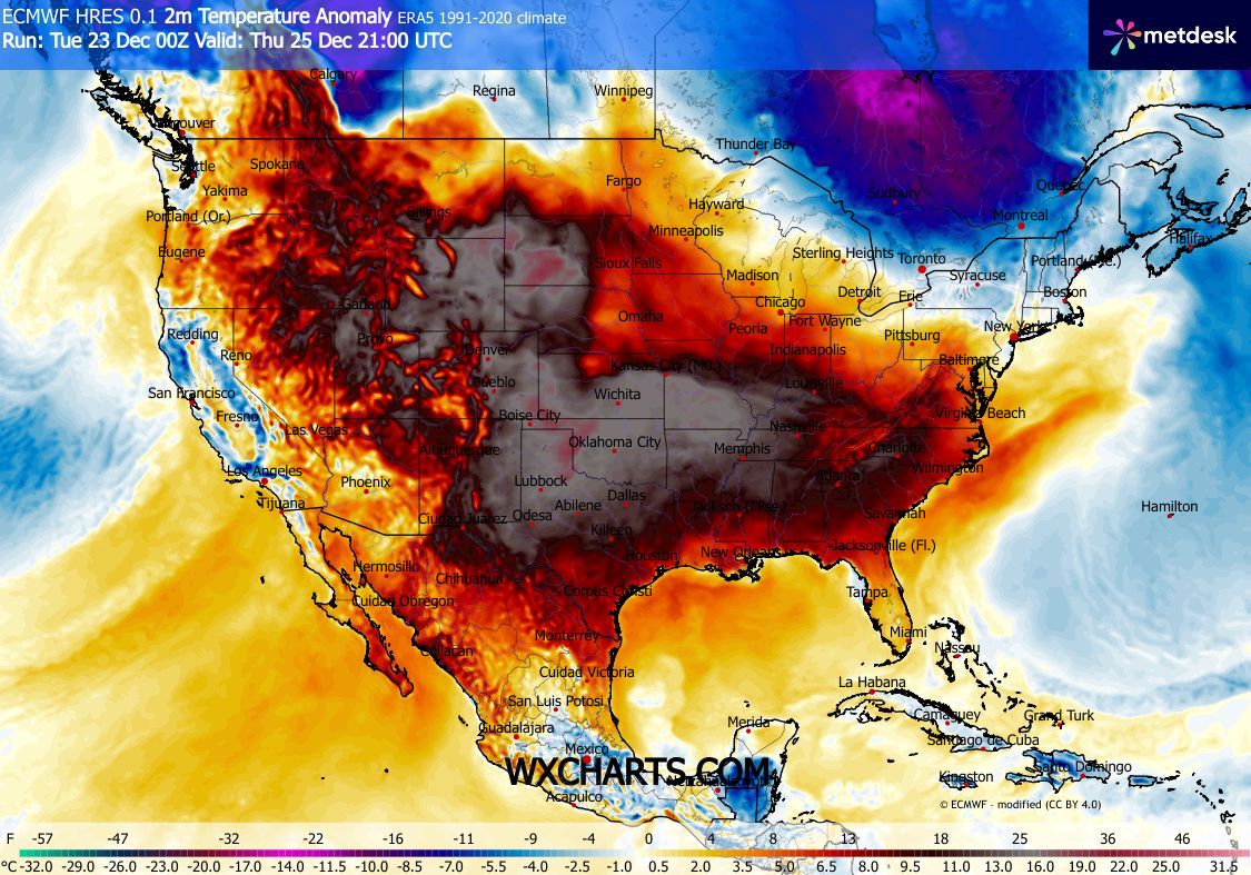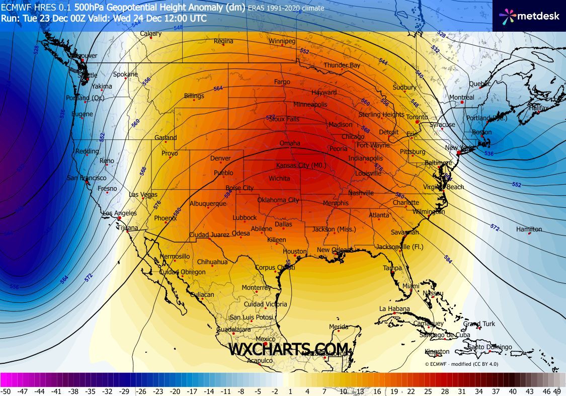 A potent atmospheric river will bring abundant precipitation to the Western US over the Christmas period. 5-day precipitation totals of more than 250 mm are likely in the mountain ranges of California. Over the Midwest, a strong subtropical ridge will lead to well-above average temperatures. In the Great Plains, the warmest Christmas Day on record may be observed.