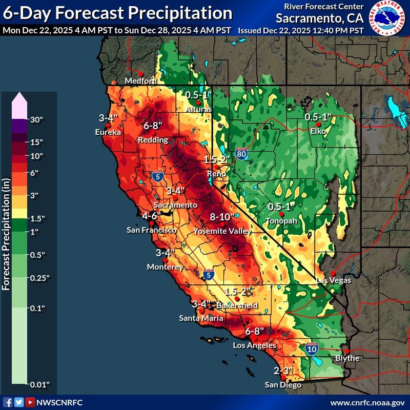 An active Pacific jet stream pattern is currently affecting North America. A large trough is located off the west coast of the US. Ahead of said trough, a potent atmospheric river has developed, bringing moist air masses to the Western US. In the past few days, heavy rains have already impacted California. In parts of the Sierra Nevada, precipitation totals of more than 500 mm have already been observed in the past 72 h. Throughout the Christmas season, another powerful storm is expected to impact California. Along westward-facing flanks of the Coastal Mountain ranges and the Sierra Nevada, 5-day precipitation totals well above 250 mm are likely.