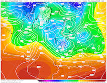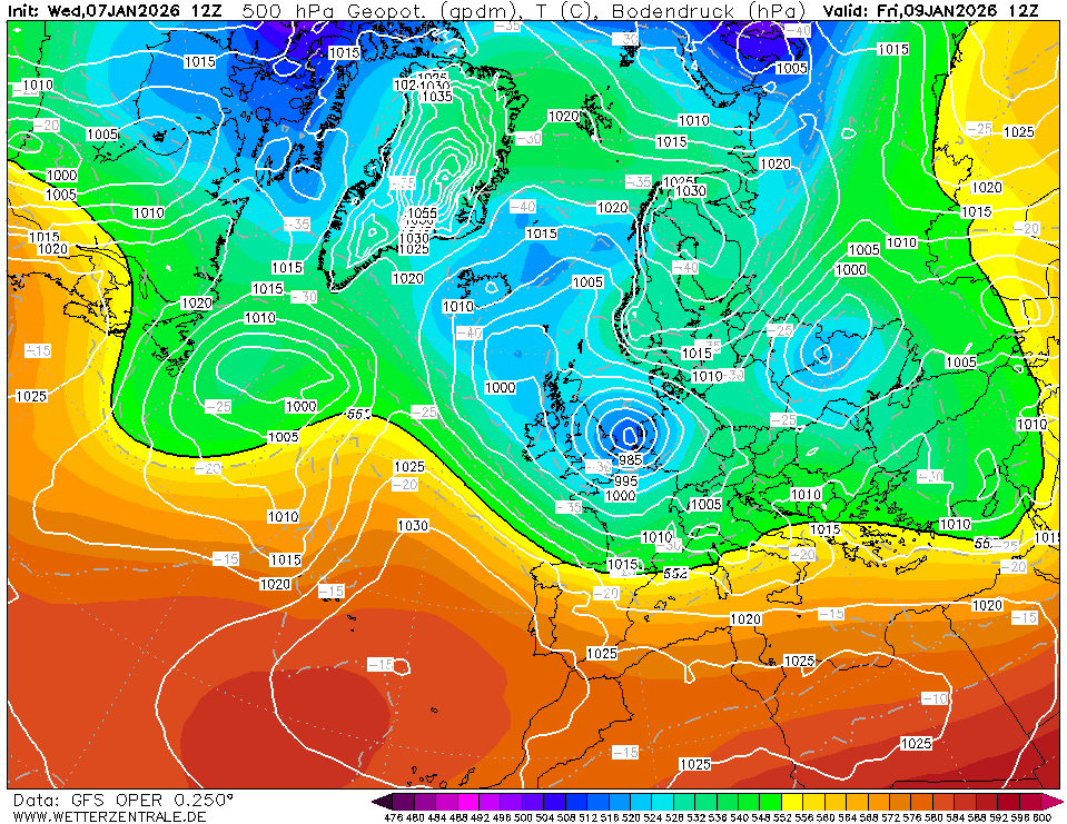 500 hPa geopotential and sea-surface pressure over Europe, 07.01 12 UTC
