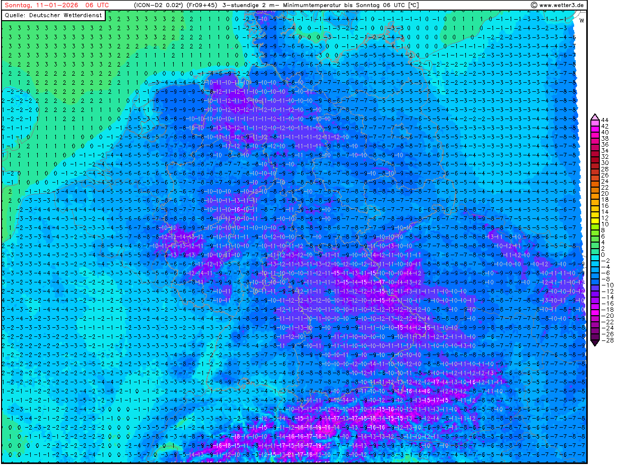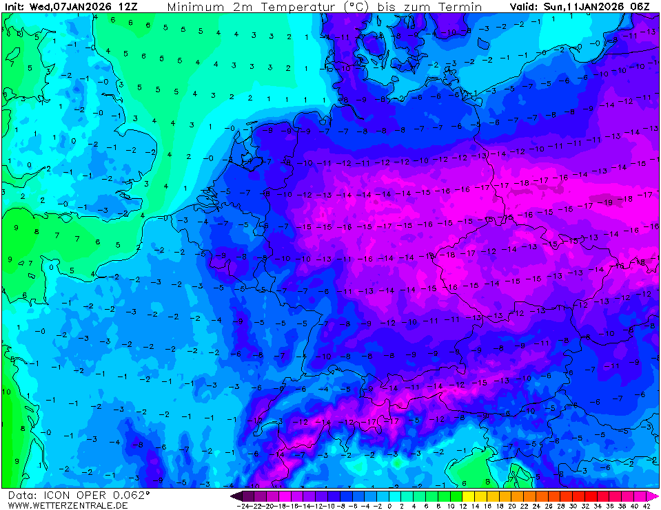 | 2 m minimum temperature over Central Europe, 11.01 06 UTC