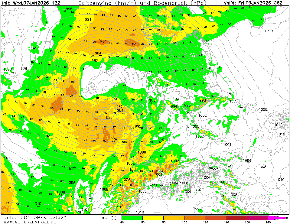 The secondary phase of low Elli will feature rapidly decreasing temperatures over the central part of Germany. Here, the most dynamic weather of low Ellie is expected. Before noon on Friday, the snow line across the Eifel, Westerwald, and Sauerland mountains is forecasted to fall to 400 m. Heavy showers and high winds are expected to cause major travel disruptions. Until Saturday afternoon, January 10, 2026, fresh snow accumulations of more than 20 cm are possible. Wind gusts of more than 90 kph on Friday pose a significant risk for snow drifts. By Friday night, the snow line will drop to the valleys, and even at the lowest elevations, a snow cover may build. On Saturday evening, winds subside, and temperatures are predicted to drop rapidly. Low temperatures on Sunday morning, January 11, 2026, are very difficult to forecast but may likely reach below -10 °C. Temperatures below -15 °C cannot be excluded.