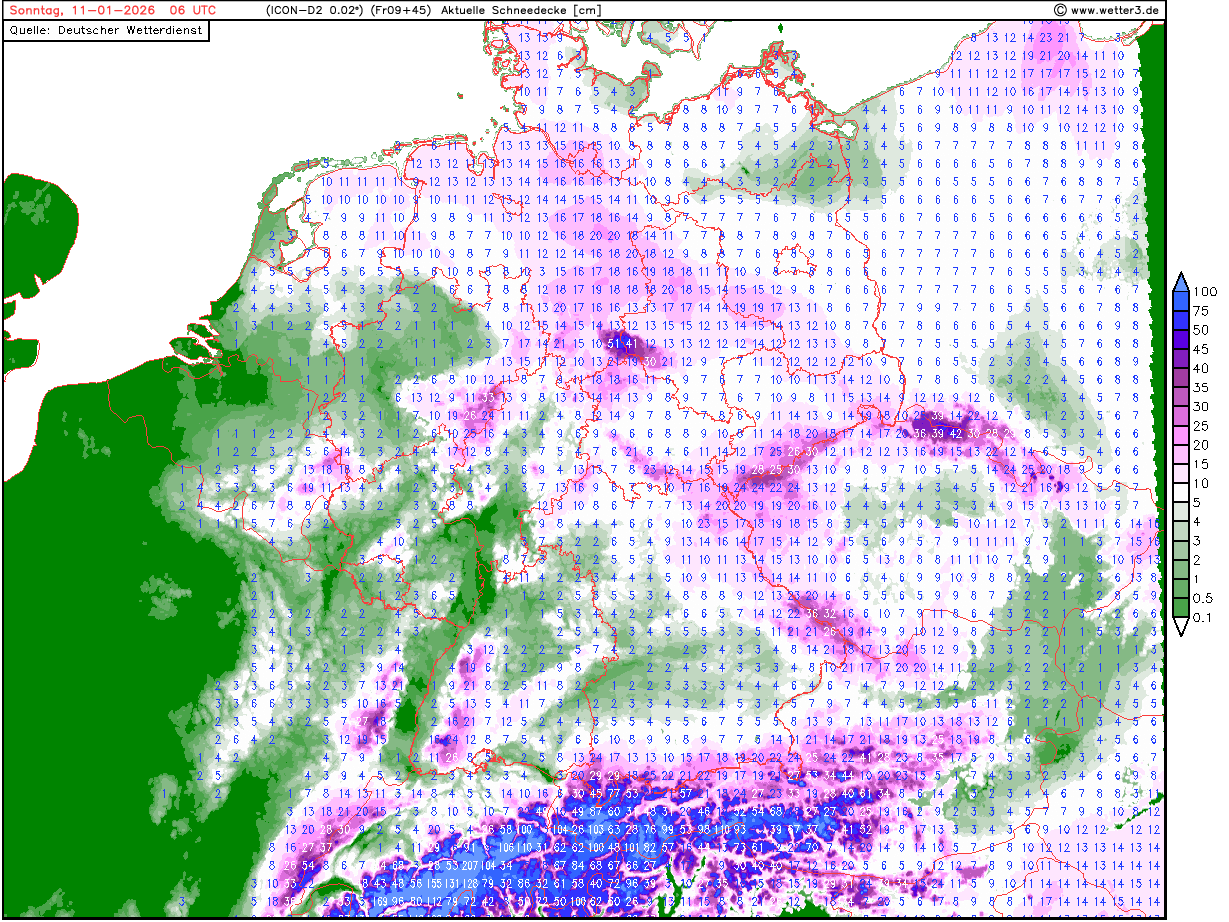 In the coming hours, a complex interaction of low Elli with a trough over Eastern Europe is anticipated. Subsequently, the forward motion of low Elli will stall over Western Germany, and the low will slowly drift southeastwards. Cold air masses can advance around the center of Elli. Subsequently, the snow line across Western Germany will drop. By early Saturday morning, January 10, 2026, the snow line will reach the lowest valleys in Western Germany. At elevations above 400 m, heavy snow is already starting to fall in the Eifel mountains. By Saturday evening, fresh snow accumulations of up to 20 cm in the Eifel, Westerwald, and Sauerland must be expected. In the Black Forest, persistent heavy snow showers give the potential for fresh snow accumulations of more than 50 cm by Sunday morning, January 11, 2026, at elevations above 800 m. With clear skies, frigid low temperatures below -10 °C are forecast over Central Germany on Sunday morning.