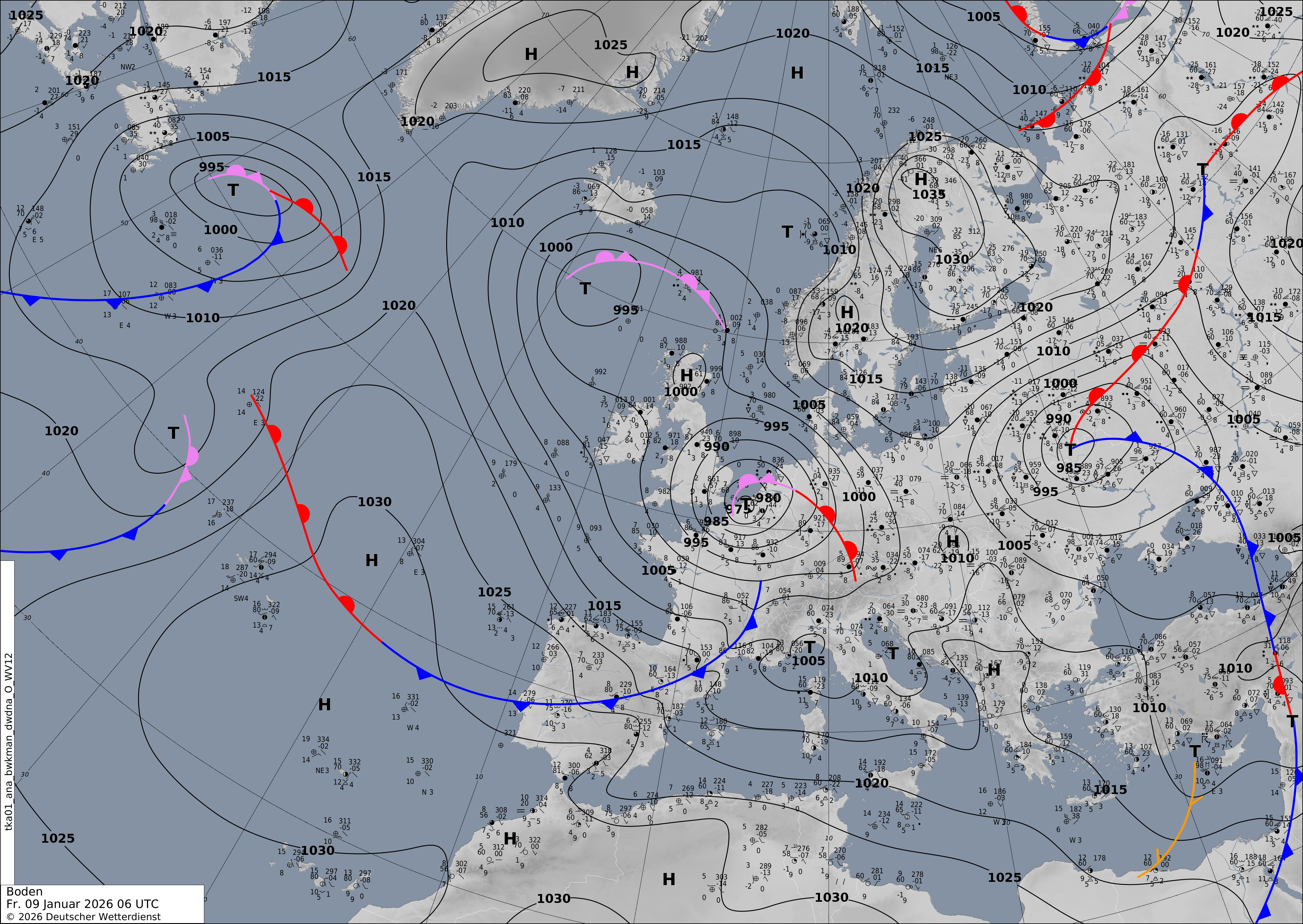 Sea-level pressure and analyzed fronts over Europe, 09.01 06 UTC