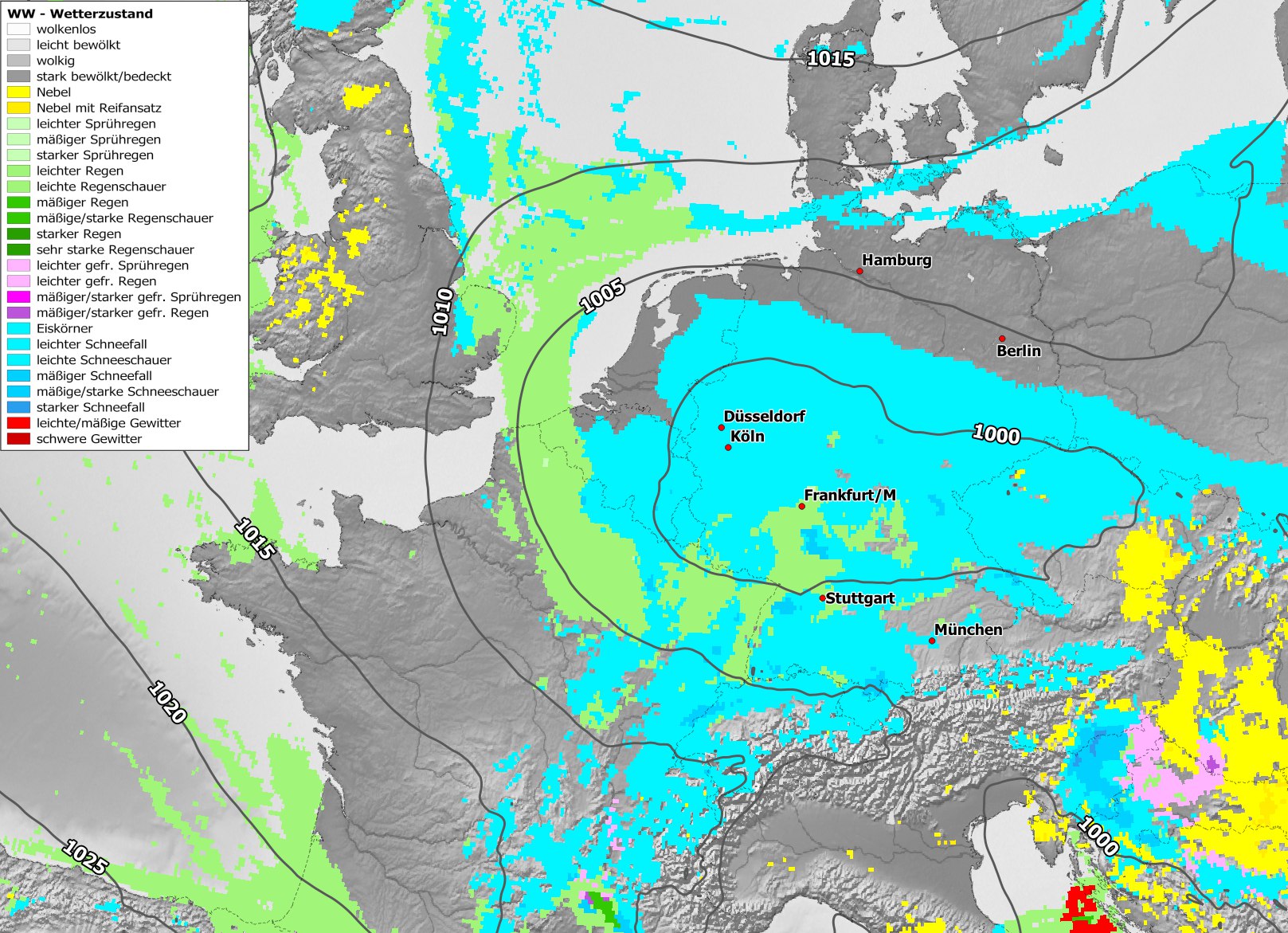 The start of the weather year 2026 has been frigid in Central Europe. Strong negative temperature deviations dominate across the region. Over the North Atlantic, a surface low is forecast to develop and move eastwards towards Europe. Approaching the British Isles on Thursday, January 08, 2026, the warm front of said low-pressure system named Ellie is forecasted to reach Western Germany. With the warm front, milder air masses can advance eastwards across Central Europe. Initially, the precipitation will mostly fall as snow. With the advancing milder air masses, the precipitation over Western Germany will shift into rain in the night to Friday, January 09, 2026. Due to cold temperatures before the arrival of surface low Elli, freezing rain must be expected on frozen grounds.