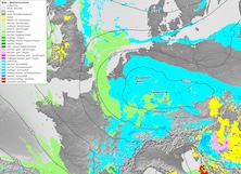 In Southwestern Germany, temperatures may rise to 8 °C in the warm sector of low Elli early on Friday. On Friday, a complex interaction of low Elli with a trough over Eastern Europe is anticipated. As such, the forward motion of the surface low will stall, and the surface low will subsequently track slowly southeastwards. The attached warm front will also stall over Northern Germany. The further northeast, the likelier that all the precipitation related to low Ellie will accumulate as snow. Fresh snow accumulations of up to 10 cm are likely. High winds are expected to induce significant snow drifts due to prevalent snow cover.