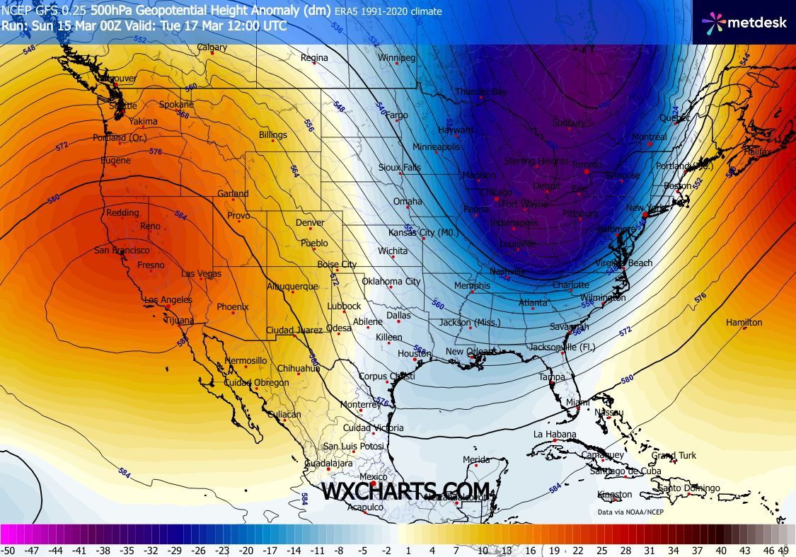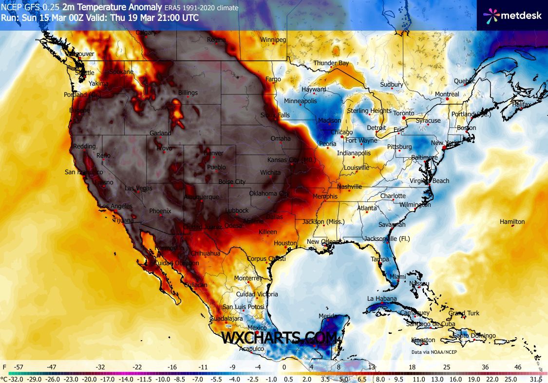 An unprecedented early-spring heat wave is forecast to impact the US West Coast in the coming week. Temperatures will be running way above average. Although it is mid-March, monthly temperature records for April may be broken in the Southern Deserts. Concurrently, a major snowstorm is expected to impact Minnesota and the Upper Peninsula of Michigan.