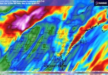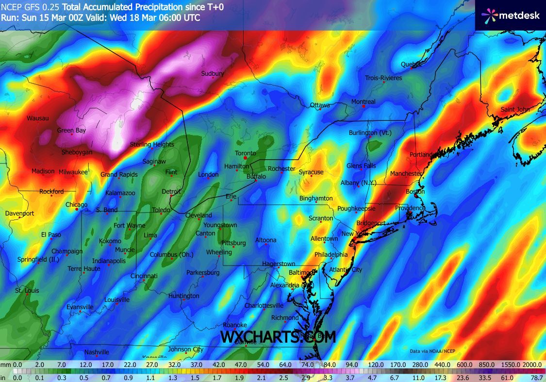 A highly distorted synoptic pattern has developed across the US. From west to east, there is an unusually strong trough located north of Hawaii, bringing torrential rains to the island chain. Over the Eastern Pacific, an enormous ridge has developed, which is slowly drifting eastwards in the coming days, impacting the US West Coast. Further east, a large trough has plunged southwards east of the Rocky Mountains. Ahead of this trough, moist air masses are advected far northwards into the Northern Great Plains and Great Lakes area. Here, the moist air masses meet a cold air mass residing across the area. At the boundary, heavy precipitation is expected. Due to the cold temperatures, most of the precipitation will fall as snow. Only in the southern parts of the air mass boundary are significant threats to icing present. Stretching from the Twin Cities into the Upper Peninsula in Michigan, widespread fresh snow accumulations of more than 30 cm are possible. Near Marquette, MI, fresh snow accumulations of more than 60 cm with the potential for snow totals of up to 100 cm in extreme cases. Together with high winds, blizzard conditions will persist until Tuesday, March 17, 2026.