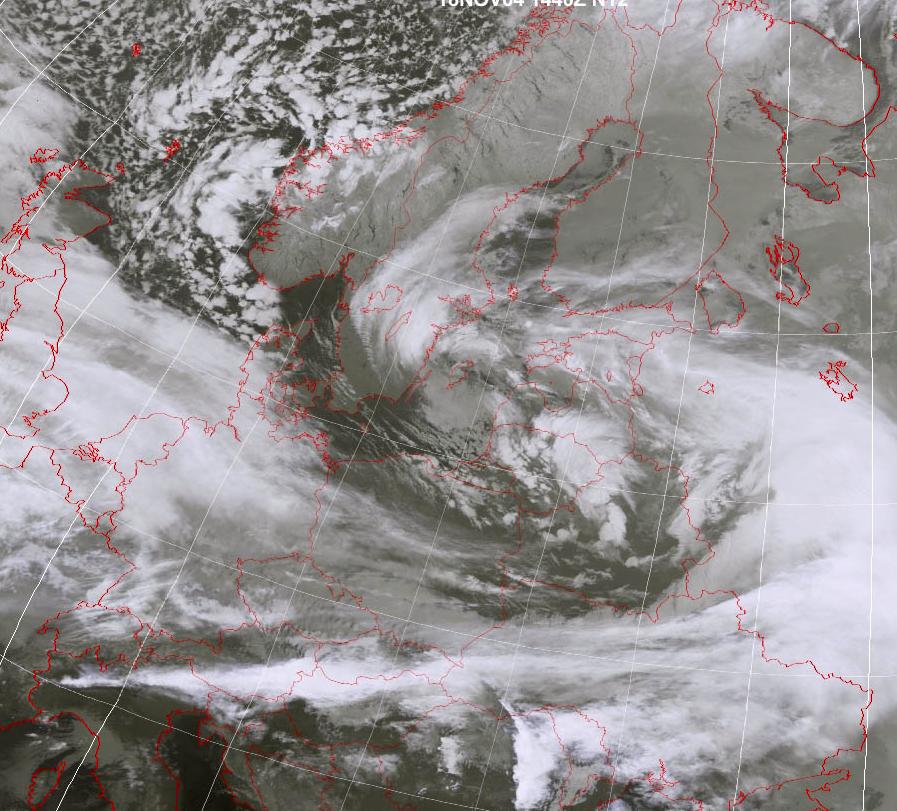 Sturm und Starkniederschläge "Pia" & "Quimburga" Deutschland 17.-19.11.2004 Satellitenbild: 18.11.04, 9:38 UTC, NOAA 17 VIS Quelle: M. Wienzek |