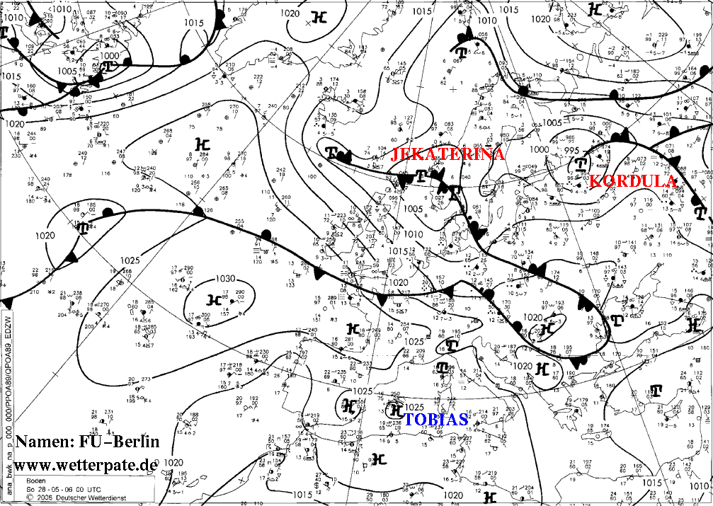 Wetterlage und Entwicklung Nur knapp eine Woche, nachdem das Tiefdruckgebiet Gertrud mit Orkanböen über Deutschland hinweggebraust war, sorgte die rege Tiefdrucktätigkeit in Mitteleuropa erneut für heftige Wettererscheinungen; dieses Mal fielen besonders ergiebige Niederschläge, die mancherorts binnen 48 Stunden mehr als 100 mm brachten. Die ungewöhnlich kräftige und eher für das Winterhalbjahr typische Westwindzone verlief weit südlich und steuerte am 26. und 27. zwei Wolken- und Niederschlagsgebiete nach Deutschland. Das erste erreichte im Laufe des 26.5.2006 den Westen des Landes und gehörte zur Warmfront eines Tief über dem Nordatlantik. Ergiebige und anhaltende Regenfälle führten von Nordrhein-Westfalen über Hessen und das nördliche Baden-Württemberg bis nach Nordbayern zu Mengen, die vielerorts zwischen 30 und 50 mm lagen, den größten Wert registierte bis zum Morgen des 27.5. der Großer Arber im Bayerischen Wald mit 68 mm. Ganz im Norden und ganz im Süden regnete es wenig oder gar nicht, in Rheinfelden stieg dafür die Temperatur bis 23°C. Im Tagesverlauf frischte auch der Wind kräftig auf, Sturm- bzw. Orkanböen blieben allerdings auf die Berglagen beschränkt (zB Feuerkogel 159 km/h, Wendelstein 126 km/h). In den Niederungen traten einzelne stürmische Böen auf (zB Freiburg, Pforzheim). Nur wenig später überzog ein zweites Frontensystem wieder die Mitte des Landes mit Regenwolken, die erneut große Regenmengen brachten. Zunächst fiel der Regen in einem breiten Streifen an einer wellenden Front, in der Nacht zum 28.5. formierte sich das Regenband schließlich entlang der langsam südwärts schwenkenden Kaltfront (siehe Radarbilder). Die Frontpassage bedeutete das Ende der Westlage, die Strömung drehte auf Nord und lenkte Kaltluft aus dem Nordmeer heran. Regenmengen, die innerhalb kurzer Zeit bis über 100 mm erreichen und nicht nur lokal in Form von Gewittern, sondern in einem ausgedehnteren Gebiet niedergehen, können zumindest an kleineren Bächen und Flüssen die Pegel stark ansteigen lassen, zum Teil treten die Gewässer auch über die Ufer. Besonders betroffen war Nordostbayern (Oberfranken), wo im Landkreis Kulmbach Katastrophenalarm ausgelöst wurde. Für den Meinleuser Ortsteil Pölz wurde sogar eine Evakuierung angeordnet, dann aber doch nicht umgesetzt. Auch in den Landkreisen Wunsiedel, Bayreuth, Lichtenfels und Kronach standen ganze Straßenzüge und Keller unter Wasser, örtlich fiel der Strom aus. Insgesamt wird der Schaden auf mehrere Millionen Euro geschätzt.