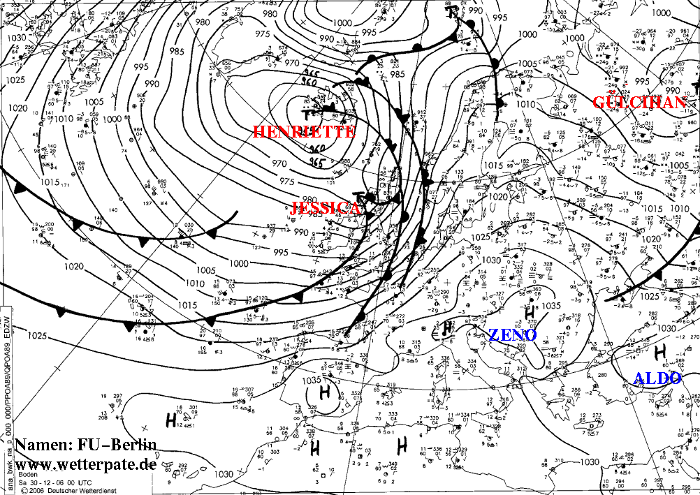 Bodendruckanalysen vom 30.12.2006 bis zum 2.1.2007 und 500 hPa-Geopotential,