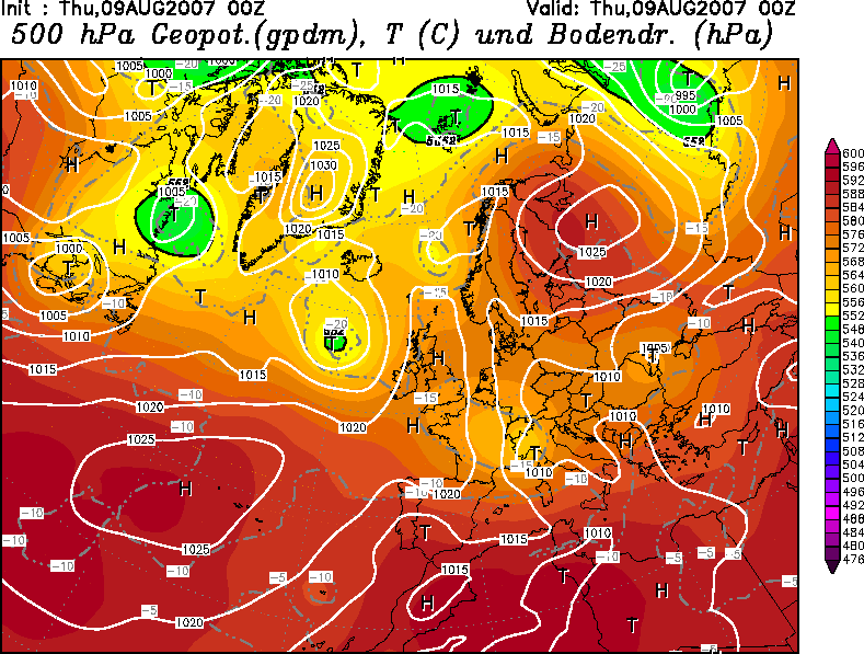 500 hPa-Geopotential und Bodendruck vom 06. bis 11.08.2007, jeweils 00 UTC