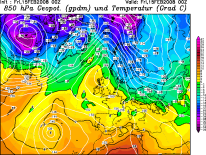 850 hPa-Geopotential und -Temperatur vom 14. bis 19.02.2008, jeweils 00 UTC