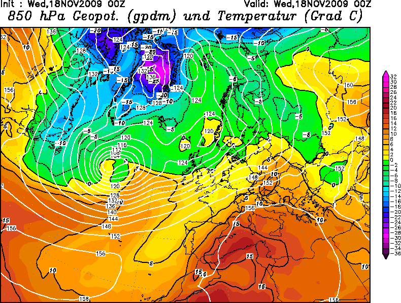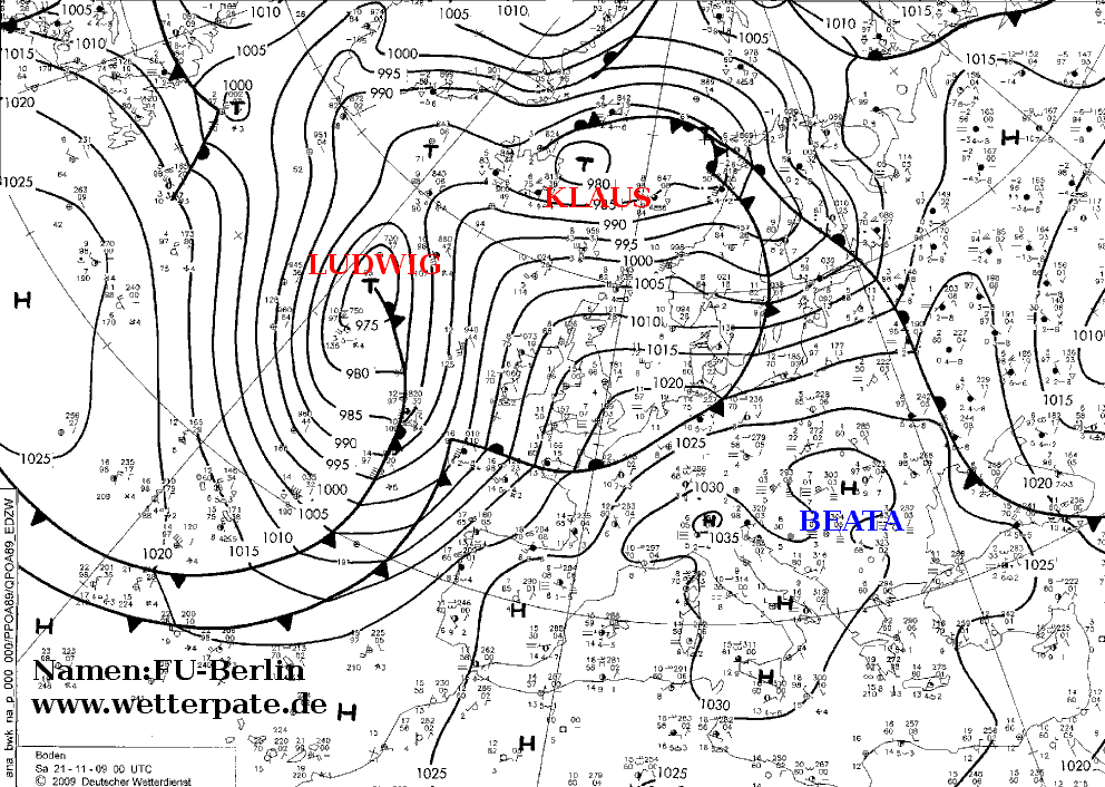 Wetterlage und Entwicklung Nachdem bereits "Hans" (siehe Artikel) und "Jürgen" (siehe Artikel) neben Sturm auch für kräftige Regenfälle gesorgt hatten, stand den Britischen Inseln zum Ende der zweiten Novemberdekade eine Hochwasserlage bevor. Dabei zog auf der Vorderseite eines langwelligen nordatlantischen Höhentroges die Kaltfront von Orkantief "Klaus" mit Zentrum bei Island nur sehr langsam über die Inseln hinweg; unter anderem verhinderte eine in der Nacht zum 20. über Schottland nordostwärts ablaufende Welle ein zügiges Vorankommen der Front nach Südosten.