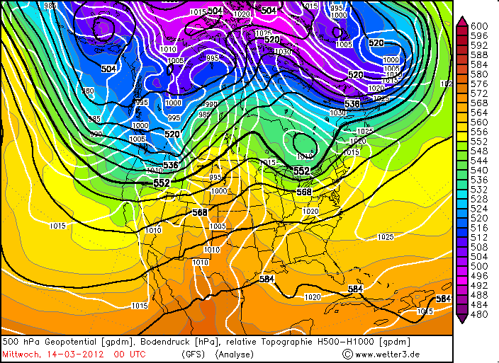 Eine für den Monat März beispiellose Wärmeperiode vollzog sich im Frühjahr 2012 in weiten Teilen des nordamerikanischen Kontinents. Während an der Amerikanischen Pazifikküste in den Bundesstaaten Oregon und Kalifornien rekordverdächtig späte und kräftige Schneefälle niedergingen, hatte ein für die Jahreszeit extrem warmer Witterungsabschnitt den Nordosten der USA und den Süden Kanadas fest im Griff. Mit der Intensivierung eines Tiefdruckgebietes entwickelten sich derweil über den Southern Plains und über dem Mississippigebiet heftige, schadenbringende Gewitter und Regenfälle.