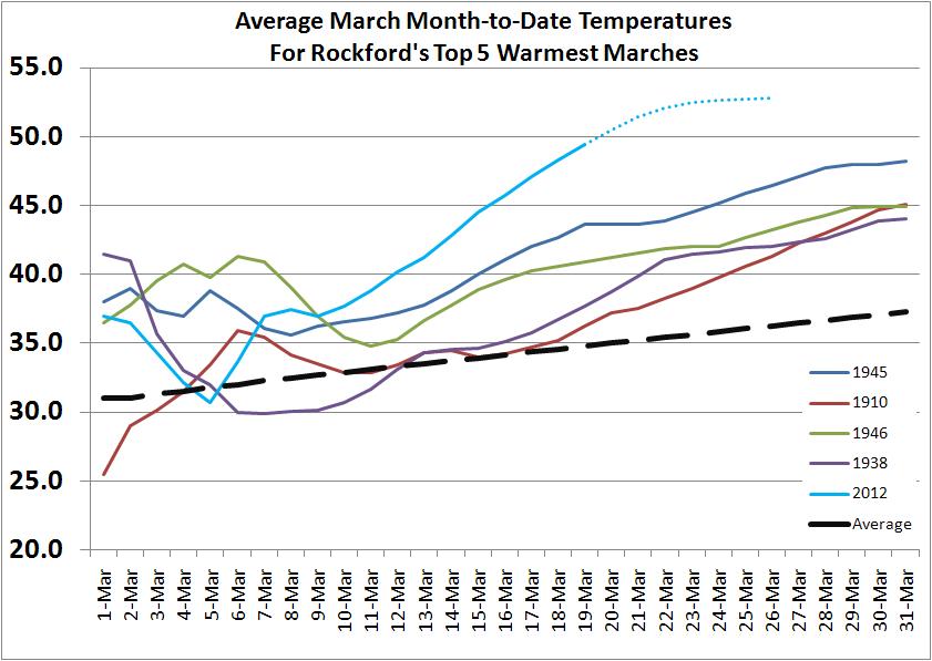 Nicht nur die Anzahl neuer Rekorde war außergewöhnlich, vor allem die Andauer der Wärme und das lange Verweilen der Warmluft sorgte für weitere Besonderheiten. So verblieb auf dem 1.917 Meter hohen Mount Washington im Bundesstaat New Hampshire am 21.03. die Tiefsttemperatur (6.6 °C) sogar über dem alten Tagesrekord der Höchsttemperatur (6.1 °C). Ähnliches fand in Marquette (MI) oder in Rochester (MN) statt, wo die Temperatur auch während der Nacht um 2 °C über dem alten Tageshöchstwert stehen blieb. Eindrucksvoll waren die Höchsttemperaturen in der kanadischen Stadt St. John und im Kejimkujik Park (siehe auch Tabelle). Die dort erreichten Maxima brachen nicht nur die Rekorde für den Monat März, sondern überboten sogar die im April jemals gemessenen absoluten Höchstwerte. So wurden in St. John 27 °C gemessen, der alte Rekord für März lag bei gerade einmal 18 °C. Auch im April konnte man dort bei höherem Sonnenstand und fortgeschrittener Jahreszeit bisher nur einen Höchstwert von 23 °C beobachten. Im Kejimkujik Park stieg das Quecksilber bis auf 28 °C, etwa 5 °C über dem bisherigen Monatsrekord und auch 3 °C über dem absoluten Temperaturmaxima von 25 °C im April. Nachfolgende Grafiken zeigen zur Linken die im März überbotenen oder eingestellten Monatsrekorde der Höchsttemperatur. Rechts zu sehen sind Temperaturverläufe in Chicago und in Rockford, beide im Bundesstaat Illinois gelegen. Deutlich erkennbar sind die hohen positiven Abweichungen der Temperaturverläufe gegenüber dem langjährigen Mittel und auch gegenüber früheren extremen Märztemperaturen. Im Verlauf der Wärmeperiode lagen in Chicago selbst die Tiefstwerte weitaus höher als die für März übliche Mitteltemperatur. Der absolute Höchstwert für März wurde in der Stadt am Michigansee um nur 1 °C verfehlt. Insgesamt traten über dem Nordosten der USA und über Südkanada großflächig extreme positive Temperaturanomalien weit über 10 Kelvin, örtlich auch bis zu 20 Kelvin auf. Es ist davon auszugehen, dass der März 2012 verbreitet als bisher wärmster in die Geschichte eingehen wird.