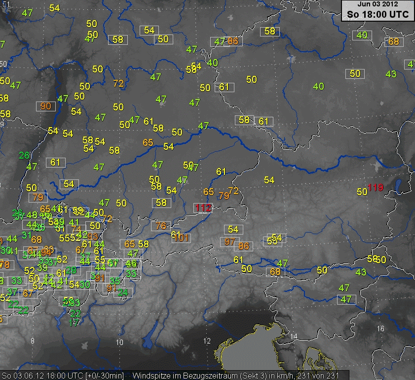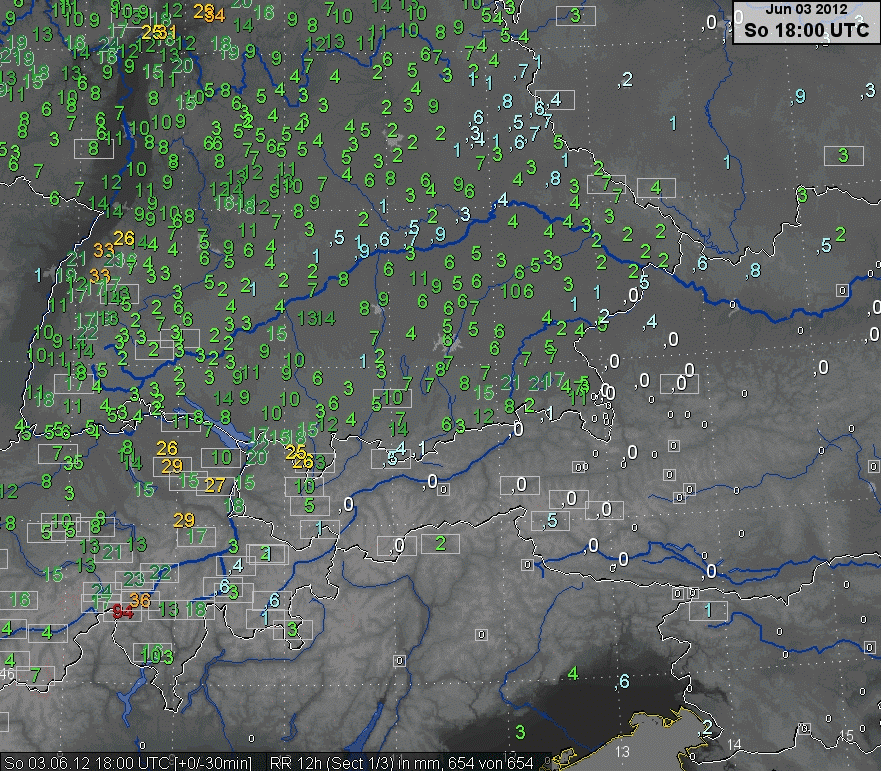 Zum 03.06. kam die feuchtwarme Mittelmeerluft bis ins südliche Mitteleuropa und weiter bis nach Südost- und Osteuropa voran. Im 850-hPa-Niveau, etwa 1.500 Meter über dem Meeresspiegel entsprechend, erstreckte sich die 15-°C-Isotherme nordwärts bis über den Alpenraum. Gleichzeitig formierte sich, ausgehend von dem skandinavischen Tiefdruckkomplex, über den Britischen Inseln ein Randtrog, auf dessen Vorderseite durch Hebungsprozesse eine Tiefdruckentwicklung in Gang kam. Das neu entstandene Tief "Bergit" zapfte auf dessen Rückseite kalte, maritime Luftmassen an und transportierte diese per Kaltluftadvektion weiter südostwärts. Über Süddeutschland und über dem Alpenraum maximierten sich die Temperaturgegensätze, was im Verlauf des 03.06. und während des 04.06. zur Entwicklung örtlich kräftiger Gewitter und starker Regenfälle führte. Gewitter und Starkregen Tief "Bergit" schlug am 03.06. eine östliche Zugbahn ein und überquerte im Tagesverlauf Deutschland auf einer Linie Hunsrück - Rhein-Main-Gebiet - Nordfranken. Nördlich des Tiefkerns bildeten sich in der kälteren Luftmasse ausgedehnte, stratiforme Niederschläge aus. In Teilen des Münsterlandes, Ostwestfalens oder der Lüneburger Heide verharrten dabei die Temperaturen mit maximal 9 °C im einstelligen Bereich. Anders sah es in Süddeutschland aus, wo mit Warmluftadvektion und Föhnunterstützung am Alpenrand nochmals Temperaturen um 25 °C verzeichnet werden konnten (Garmisch-Partenkirchen, München). Noch höhere Werte zeigte das Quecksilber mit bis zu 29 °C in Teilen Österreichs (z.B. Wiener Neustadt).