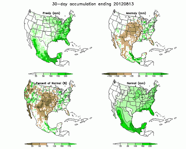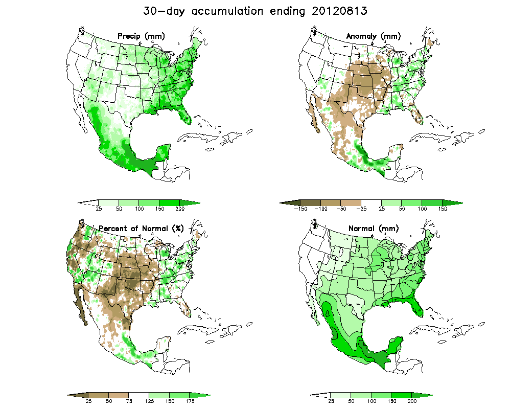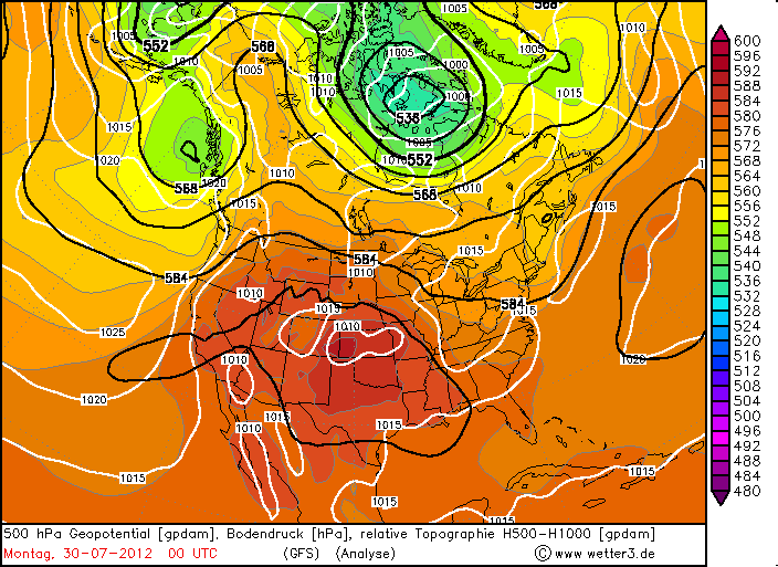 Im Juli und August 2012 setzte sich die außergewöhnlich warme Witterung fort. Gründe hierfür liegen vor allem im persistenten großräumigen Strömungsmuster über Nordamerika und in der Nordhemisphäre. Die Folge waren über einer Region lang anhaltende und beständige Großwetterlagen, die in den USA häufig den Vorstoß und das Verweilen sehr warmer Luftmassen südlicheren Ursprungs möglich machten. Häufig wölbte sich über dem nordamerikamischen Kontinent ein langwelliger und mit sehr warmer Luft gefüllter Höhenrücken auf, der große Teile der USA viel Sonnenschein, wenige Wolken, kaum Niederschlag und sehr hohe Temperaturen brachte. Lange Wellen in der oberen Troposphäre neigen dazu, sich kaum nach Ost oder West zu verlagern und verbleiben damit oft quasistationär an Ort und Stelle. Über Nordamerika auffällig weit in den Norden zurückgedrängt schien in den letzten Monaten die planetarische Frontalzone zu sein, welche maßgeblich für großräumige Niederschläge verantwortlich ist. Damit konnte, abseits kurzer Unterbrechungen, trockene, niederschlagsarme und sehr heiße Luft subtropischen Ursprungs lange Zeit über den USA verweilen.