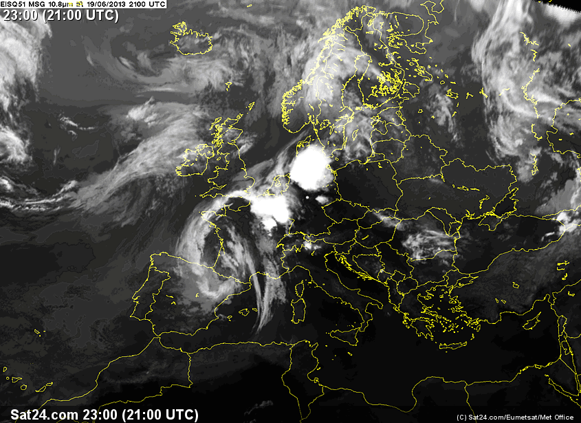 Allerdings nahm ab dem 17.06. die Gewitterneigung mit dem von Westen her zögerlich herannahenden Höhentief auch in Frankreich und Mitteleuropa stetig zu. Vorderseitig des Höhentroges verursachte vor allem die vertikal zunehmende Advektion positiver Vorticity (Wirbelgröße) großräumige Hebung, die die konvektive Hemmung verringerte und die Bildung von kräftigen Gewittern in der sehr energiereichen Luftmasse ermöglichte. Höhendivergenz verursachte Druckfall am Boden und im Bereich von flachen Tiefdruckgebieten und Tiefdruckrinnen entstanden Frontensysteme, Konvergenzzonen oder Konvergenzlinien, die zum Teil heftige Gewitter auslösten. Im Umfeld der Alpen und Mittelgebirge sorgten thermische Windsysteme für Konvergenzen und für die Entwicklung kräftiger orographischer Gewitter. Am 17.06. erfassten bereits am Vormittag kräftige Gewitter den Nordwesten Frankreichs, auch die Hauptstadt Paris war davon betroffen. Am Nachmittag und Abend bildete sich am Frontensystem von "Manni" über Westfrankreich eine lange, nahezu strömungsparallel ausgerichtete Gewitterlinie. Aus Arvert an der Atlantikküste wurde eine 2-stündige Niederschlagsmenge von 44 mm gemeldet. An einigen Orten fiel 4 cm großer Hagel, in Toury zwischen Orleans und Paris gab es 5 cm großen Hagel. Am 18.06. hielt die Gewitteraktivität über dem Westen und der Mitte Frankreichs weiter an, allerdings fielen die Zellen im Vergleich zum Vortag schwächer aus. Dafür entwickelten sich entlang einer Tiefdruckrinne in Südpolen, Tschechien sowie in Teilen der Slowakei heftige Gewitter, die sich bei hoher Labilität und günstiger Windscherung zu Multizellen und Superzellen organisierten. Viele Meldungen von Großhagel über 5 cm gingen ein. Bei Ciekoty (PL) fielen 7 cm, bei Kowala Mala (PL) sogar 9 cm große Hagelkörner. Gegen Abend bildeten sich in einer südsüdöstlichen Strömung im Lee des Arlbergs, der Glarner und der Appenzeller Alpen mehrere Gewitter, die sich zu Multizellen zusammenschlossen und in der Nordostschweiz bei Zürich 4 bis 5 cm großen Hagel brachten. In Lindau am Bodensee erreichte der Downburst des Gewittersystems orkanartige Stärke. Dort wurde eine Spitzenböe von 115 km/h gemessen. Am 19.06. kamen die Frontensysteme von "Manni" samt vorlaufenden Konvergenzlinien weiter nach Osten voran und lösten in Nordostfrankreich teilweise heftige Gewitter aus. Das markanteste Ereignis war eine Superzelle zwischen der Champagne und dem Burgund, die im Bereich eines rechtsdrehenden Windprofils durch bodennahe Nordostwinde unter einer südsüdöstlichen Höhenströmung entstehen konnte. Gegen 17:40 MESZ wurde die Superzelle tornadoträchtig. Ein EF3-Tornado hatte bei Etrochey in einer 14 Kilometer langen Schneise Bodenkontakt und verursachte erhebliche Schäden. Zu diesem Zeitpunkt erreichte im nahegelegenen Dijon der Taupunkt 23 °C, die sturmrelative Helizität im untersten Kilometer der Troposphäre nach Modellanalysen 132 m²/s². Damit waren die Bedingungen mit großem bodennahen Auftrieb, großer Windscherung sowie niedrigem Kondensationsniveau in der sehr feuchten Luftmasse günstig für die Bildung eines Tornados. Bereits am Vormittag waren auch im Nordwesten Deutschlands einige kräftigere Gewitter unterwegs. Stark aufgelebt hat die Gewitteraktivität aber am Abend entlang einer Konvergenzlinie über Norddeutschland, die von der Nordsee über Bremen bis nach Südniedersachsen reichte und nachfolgend ostwärts bis nach Mecklenburg-Vorpommern und Sachsen-Anhalt zog. Die Gewitterlinien produzierten kräftige Windböen in Sturmstärke. In Dörnick (SH) wurden 86 km/h gemessen, in Fassberg (NI) waren es 94 km/h. Gebietsweise regnete es auch ergiebig, so in Wittenborn (SH) mit einer 24-stündigen Niederschlagssumme von 68 mm.
