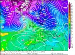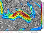 500-hPa-Geopotential mit Bodendruck, 850 hPa-pseudopotentielle Temperatur und 300 hPa Wind u. Divergenz (links: 500 hPa-Vertikalbewegung) |