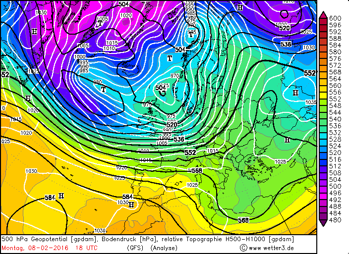 sinkendem Geopotential in 500 hPa entstand am 8. Februar nachmittags