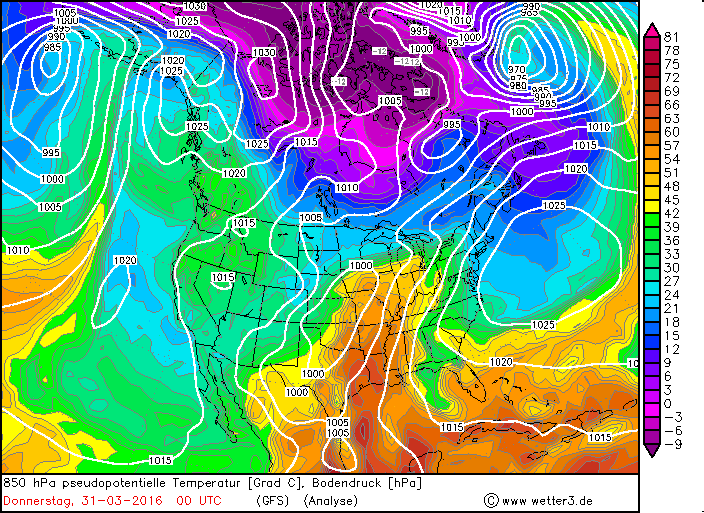 Wetterlage und Entwicklung Am 27./28.03. verlagerte sich ein kräftiger Höhentrog entlang der Westküste der USA nach Süden. Er ließ am 28.03. über dem Bundesstaat Nevada ein Bodentief entstehen. Rückseitig des Troges stieß kalte Luft bis in die Mitte von Kalifornien vor (0°C in 850 hPa). In der Folge schnürte sich ein eigenständiges Höhentief über dem Südwesten der USA ab. Am 30.03. erstreckte es sich von Kalifornien bis nach Colorado. Östlich der Rocky Mountains intensivierte sich das Bodentief aufgrund von Divergenz in der Höhe im Ausströmbereich des Subtropenjets. Am Boden advehierte der südliche Wind am 30.03. warme und feuchte Luft weit nach Norden bis nach Missouri und Iowa. Die 20°C Isotherme in 850-hPa lag am 31.03., 00 UTC über dem Norden von Texas. Gleichzeitig fing ein über der Mitte Kanadas nach Osten wandernder Höhentrog den nördlichen Teil des Höhentiefs ein und sorgte dafür, dass die Amplitude am 31.03. 06 UTC bis nach Oklahoma reichte. Vorderseitig erstreckte sich eine Bodentiefdruckrinne von Oklahoma bis zu den Großen Seen. Eine kräftige Windscherung und instabile mitteltroposhhärische Luft lieferten die Zutaten für die Entwicklung kräftiger Gewitter mit Hagel, Sturmböen und einzelnen Tornados am 30.03. (Ortszeit). Das Bodentief verlagerte sich daraufhin weiter nach Nordosten, die Kaltfront des Tiefs kam nur langsam nach Südosten voran. Vor der Kaltfront konnten sich daher am 31.03. verbreitet Gewitter bilden. Am 01.04. hielt sich die feuchtwarme Luft noch im Südosten der USA. Rückseitig der Kaltfront konnte kalte Luft aus dem Norden weit nach Süden vordringen (5°C-Temperatur in 850 hPa über Texas am 02.04. 00 UTC).