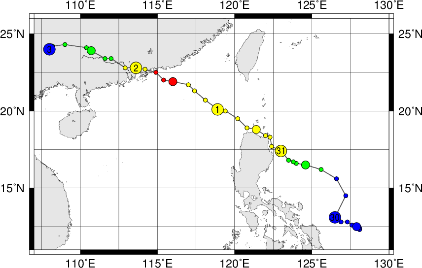 Höhepunkt ging der Taifun am 01. August um 19:35 UTC auf der Dapeng Halbinsel (Shenzhen City) in der Provinz Guangdong als vierter