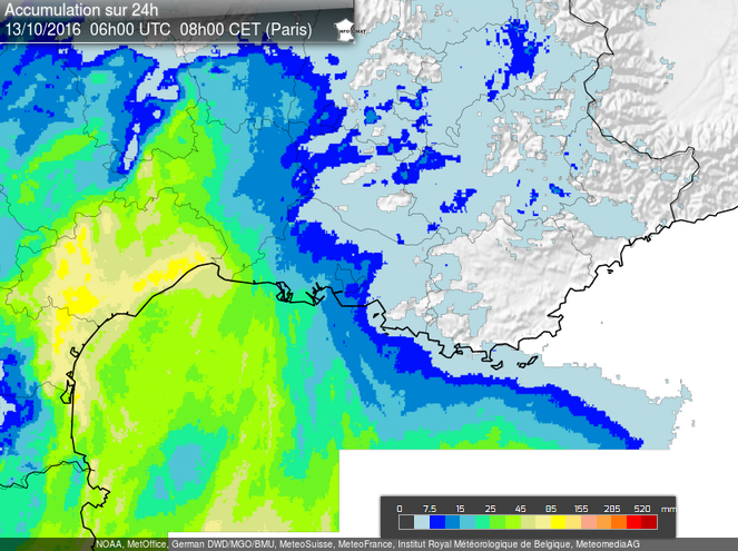 In der zweiten Oktoberdekade 2016 entwickelten sich in Südfrankreich ergiebige Regenfälle, die örtlich mit über 300 mm einhergingen. Die Starkregenfälle waren zum Teil gewittrig durchsetzt und gingen besonders im Küstenumfeld des Mittelmeers mit heftigen Windböen einher. Es entstanden einige Schäden durch Sturm, Überflutungen und Ausuferungen. Im Nordosten Spaniens (Katalonien) fielen ebenfalls Niederschläge von bis zu 100 mm binnen 24 Stunden. Mit Ostverlagerung des verantwortlichen Tiefdruckgebiets "Brigitte" gingen auch in Norditalien gebietsweise kräftige Regenfälle nieder. Lokal regnete es über 100 mm innerhalb von 24 Stunden.