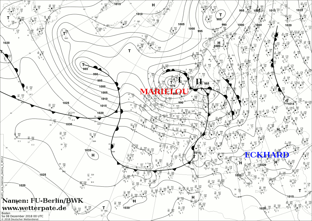 Low LUANA heralded a wet and especially mild weather situation in Germany on 06.12.2018. MARIELOU, the mother low of MARIELOU II was still on the Atlantic during this time and was only a wave disturbance. But until 07.12. she moved swiftly to the west and developed by her favorable Location in the jet stream to a storm. MARIELOU strengthened quickly and its core pressure dropped to 965 hPa! On the satellite pictures MARIELOU showed up as Storybook low. The cold front extends over France to Spain and reached Germany in the early evening. Impressive is also the postfrontal weather, which stretched across the Atlantic, as well as Ireland and the UK. The center took over the position of the controlling central low over Great Britain and in the course of the 07.12. a daughter low developed at the cold front of MARIELOUs, which was called MARIELOU II. However, these low-pressure areas were slow, as high ECKARD still partially blocked the way to the east. The front system of MARIELOU I reached Germany in the afternoon of 07.12. and brought stormy to gale-force gusts and precipitation. The strongest gust was recorded on the Feldberg (Black Forest) at 122 kph and on the Brocken at 126 kph (Source: Meteociel). In the warm air sector very mild temperatures due to the southwest winds were advected. Partly the thermometer climbed to about 13°C, as for example at Neuostheim (BW). Within the precipitation of the cold front there were some showers and thunderstorms, which reached the west of Germany around 16:00 CET. Also in the UK, MARIELOU I registered gale-force gusts. The strongest gusts (143 kph, Source: Meteociel) were measured here southwest of the low pressure center in the morning hours in the north of Great Britain. Southwest of MARIELOU I created a shortwave trough that eventually became MARIELOU II. The frontal system of MARIELOU II did not reach Germany until the late evening of the following day. The windmaxima were in the middle and in the south of Germany and reached this region from the night of Saturday to Sunday. However, the wind was refreshing throughout Germany due to the strong pressure gradient. Also on Sunday it remains windy to stormy all over Germany. With the fronts also new precipitation reached Germany mainly as stratiform rain. Occasionally, there were showers and thunderstorms when the backside weather spread to Germany. In higher areas and above all in the Alps, there was heavy snowfall due to the cold front. The temperatures remained mild in the rest of the country at 9°C. The center of MARIELOU II moved north over the North Sea to Germany. Although the storm maximum was already drawn over Germany, it remained stormy on Sunday. In the early morning were on Feldberg and Brocken Gale gusts recorded at 157 kph or 126 kph. The stations Deuselbach and Weinbiet (Rhineland-Palatinate) recorded storms with 113 kph and 119 kph respectively. Also on the Zugspitze was also measured a gale wind with 144 kph wind speed. (Source: Meteociel). Sturmtief MARIELOU II was already above the Gulf of Bothnia at this time. Germany was therefore under the influence of the back of the trough. The wind turned to the northwest and now a colder and drier air mass flowed in. In exposed locations, there was still danger of gale gusts. In the lowlands, the wind dropped largely, only in Rhineland-Palatinate and parts of Baden-Wuerttemberg and Bavaria remained stormy. All over the country, showers and thunderstorms were still possible, which were also stronger in the south than in the north.