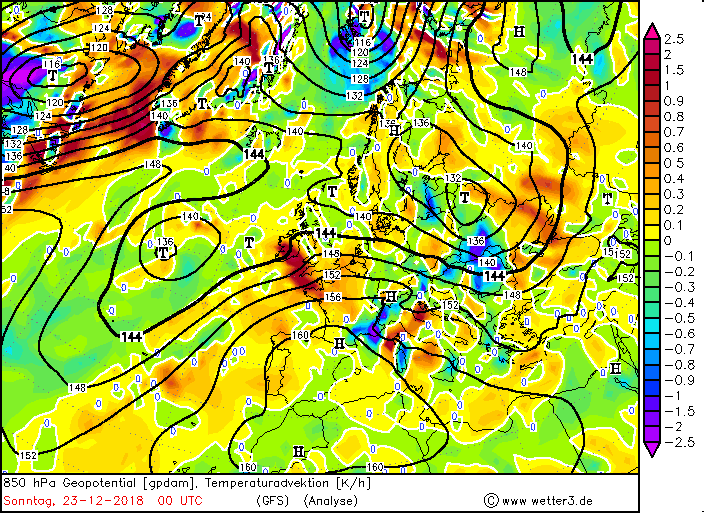 Sea Level Pressure Europe, 500-hPa-Geopotential with Sea Level Pressure, 850 hPa pseudopot. Temperature, Temperaturadvection |
