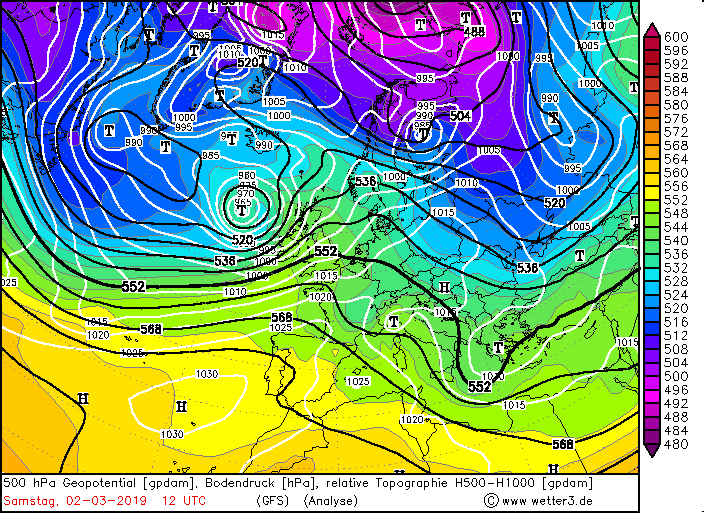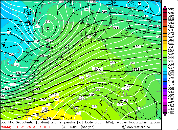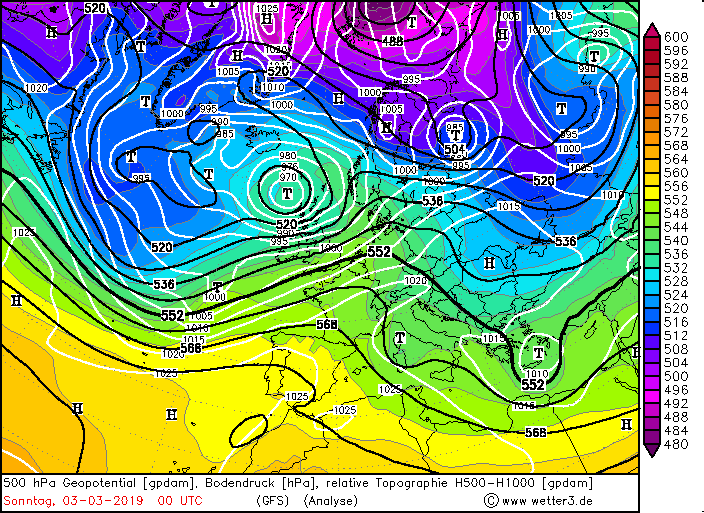 Low IGOR, which was the last winterstorm of the storm series, had formed as a wave disruption also on the Atlantic in the zonal flow amidst a strong jet stream. He quickly moved east and hit the shores of Ireland at 983 hPa on the morning of March 16, and hit Scotland's shores a short time later. Due to its favorable position in the jet stream, its pressure dropped to 967 hPa by the morning of 18 March. Above all, its cold front was pronounced and characterized by a long cloud band. Its center did not reach Germany and Central Europe. The strong gusts were mainly caused by that cold front and reached the west of Germany in the night of Sunday. During the course of the day, it moved southeast and caused especially in the low mountain ranges and the Alps edge for accumulated precipitation.