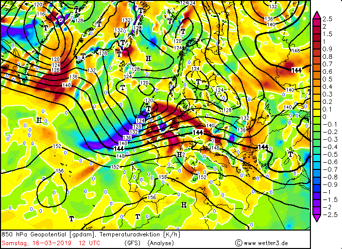On Monday and Tuesday the 11th and 12th of March, there was a brief weather calming by High GABI. But at that time a second storm low formed on the North Atlantic in Ireland already. FRANZ was already recognizable on March 10 as a wave disruption over the Western Atlantic, but quickly shifted to Iceland and intensified rapidly. Both on the geopotential maps, as well as on the 850hPa temperature maps FRANZ can be seen as a pronounced wave disturbance. From 11 March to 12 March, its pressure dropped from 990 hPa to 955 hPa, around 45 hPa. FRANZ underwent an explosive cyclogenesis due to the high positive divergence values at the right jet exit and a dry intrusion. The pressure gradient to 100km was 20 hPa (35 hPa to 300 km). Its core reached the north of the UK on the night of March 13 it formed the fringing low FRANZ I. The FRANZ II core pressure had risen to 965 hPa and the pressure gradient had fanned somewhat, but remained close to the center at 20 hPa 100 km. Due to the weakening jet stream, the pressure increased further on the way to the southwest over the North Sea. At noon, the core passed through Denmark at a pressure of 990 hPa and reached the North Sea and the Finnish Baltic Sea coasts until evening. On the front there was strong warm air advection whereby in Germany on the 12th of March the temperatures rose to 14.1 ° C (Freiburg, BW). On the back, on the other hand, there was strong cold air advection at altitude, which made the air mass very unstable. The result was heavy showers and thunderstorms the following day.