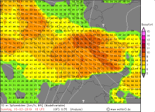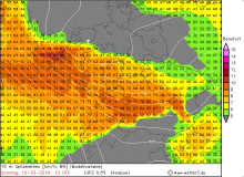 Wind and precipitation Eberhard Winterstorm EBERHARD had a firm grip on Germany on 10 March. His storm field attacked from the morning of the northwest on Germany and reached its maximum at 16:00 clock. Gusts up to 166 kph swept over exposed areas such as the Feldberg in the Black Forest. But even in the lowlands heavy storm gusts were around 100 km / h here. Damage were caused by such wind speeds. In the neighboring countries of Germany, gale gusts beyond the 150 kph were also generated, as on the Dutch offshore platform K13 A with 194 kph (source: ogimet.com), which corresponds to a categorie 3 hurricane . Whether the destructive winds are a so-called Sting Jet or 'just' the winds of the Cold Jet can not yet be said. There were cloud stripes near the core which can be a sign for a sting jet. Although the north and northeast of Germany showed little wind, it did get some precipitation in the form of rain or snow. Especially in the low mountain ranges, the air masses jammed due to the pronounced west weather situation and led to accumulated precipitation. In Freudenstadt in the Black Forest 40.4 mm came together in 24 hours, on Brocken in Hartz 27.6 mm were recorded. The temperatures were also unusual. Due to the strong warm air advection, the temperatures in southwestern Germany rose to a very mild 16°C such as. in Frankfurt and Mannheim or Lahr. Measured wind gusts (selection) in Germany (data source: Ogimet):